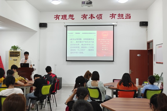 课上,2021级研究生王蕊宇以“争取和平民主”为主题,向大家介绍了历史事件重庆谈判,结合相关影视资料展现了抗日战争结束后中国共产党为争取国内和平民主所做出的巨大贡献。2021级研究生宋一凡以“祖国必将统一”为主题,以金门战役和西沙海战为主线,凸显了中国共产党为促进两岸统一所做出的巨大努力。