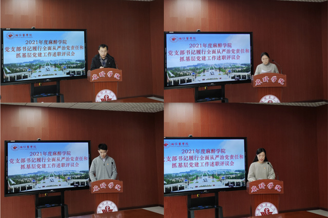 会上,麻醉临床党支部、基础党支部、学生党支部和研究生党支部书记分别就履行全面从严治党责任和抓基层党建工作作了现场述职。大家讲成绩实事求是,讲问题毫不遮掩,讲整改具体实在,既述出了特色和亮点,又述出了差距和不足,做到了见人见事见思想。