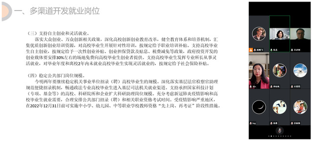 会上,刘娜对普通高校学生自主创业、基层就业、应征入伍、就业服务政策进行了详细解读,她结合往届毕业生就业基本情况,分析了当前就业形势,鼓励大家树立“先就业再择业”理念,克服“缓就业”“慢就业”思想,尽早选定比较适合的就业岗位,积极回应社会家庭与学校关切。张蕊对毕业考试有关事项做了说明,希望2022届毕业生既积极应聘,又兼顾学业,抓紧在大学的最后一学期,提高自己的专业水平和综合素质,让自己更强大、更有竞争力。李洪刚对应届生身份、网签三方协议、劳动合同的签订等问题给予解读,并表示学院会在就业信息推送、就业岗位对接等方面为同学们提供最大的帮助。