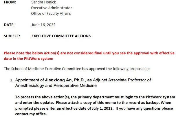 我校5278论坛 名誉院长安建雄日前受聘匹兹堡大学麻醉与围术期医学科客座副教授。