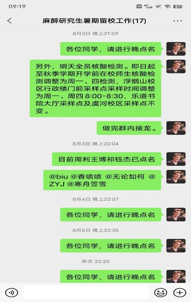 5278论坛 高度重视暑期疫情防控工作,密切关注中高风险地区学生位置异动,坚持“日报告”“零报告”制度;筑牢疫情防控安全网,关注暑期学生思想动态和各类状况变化;暑期期间共6名研究生申请留校,学院严格执行留校学生健康打卡、请销假、晚点名等制度,组织留校学生持有序开展常态化核酸检测,确保不漏一人,定期向学校汇报留校学生的状况,充分保障留校学生学习和生活安全。