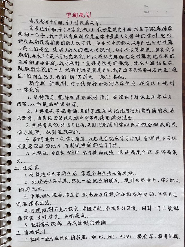 写一份学期规划,有方向。通过进一步了解自己所学的专业,从学业规划、专业规划、生活规划、能力拓展以及职业规划等方面制定自身的新学期目标。2022级新生陈紫琪同学在学业规划中写到:坚持在课前做好课程预习,提高听课效率;每天背诵英文单词,为英语四级考试做好准备;每天进行课后复习,温故而知新;定期进行学习清算,反思是否完成学习计划;今日事,今日毕,加强自律。