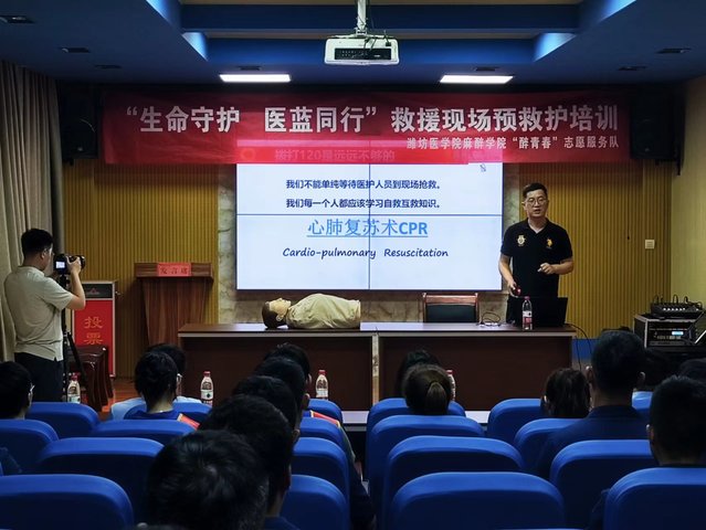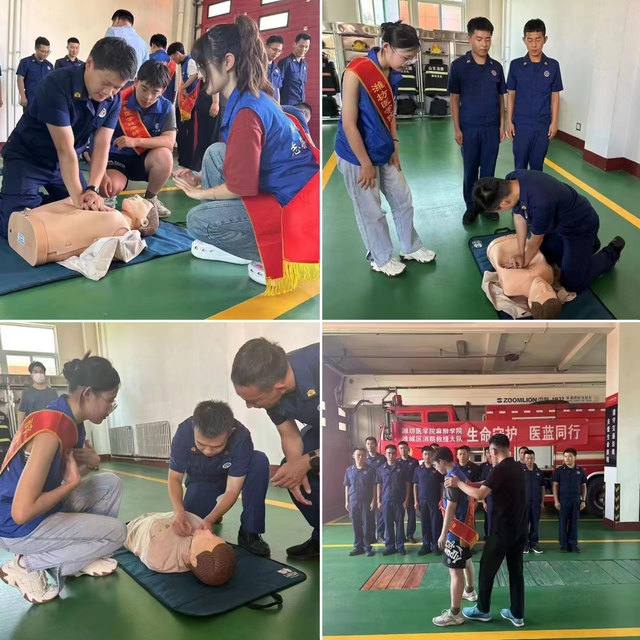 6月30日下午,潍坊医学院5278论坛 党总支组织师生党员和“醉青春”志愿服务队志愿者走进潍城区救援大队开展“庆七一”志愿服务活动,为消防员开展急救知识培训,提高消防员对灾害现场伤员及自我的应急救援能力和救援效率。
