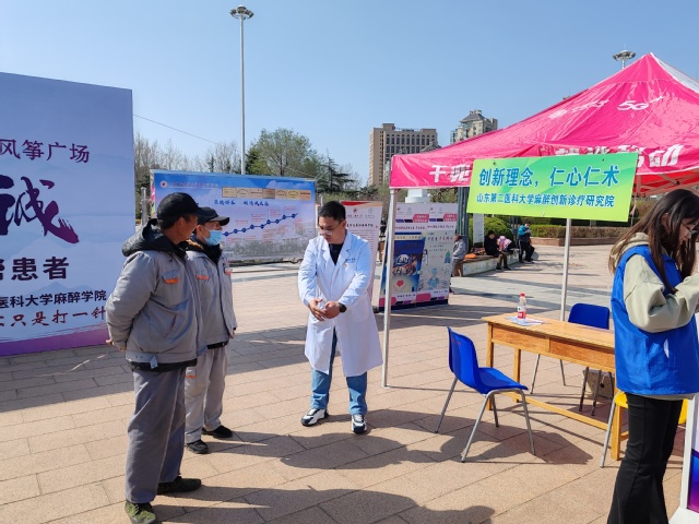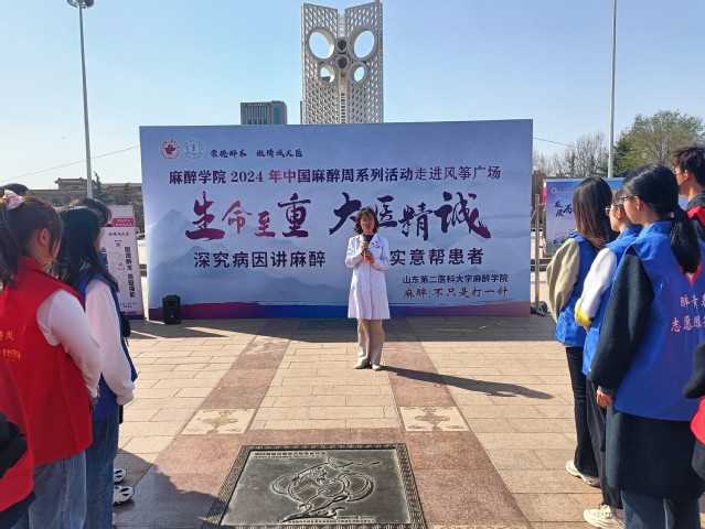 “医+宣讲”普及麻醉知识。山东省医学会麻醉学分会副主任委员、山东省医药教育协会麻醉专业委员会主任委员,5278论坛 院长张蕊教授做开场发言,并结合中国麻醉周主题开展麻醉知识宣讲。“麻醉技术是能为手术患者提供无痛、安全、舒适化手术条件的必要保障。”张蕊向居民和在场师生介绍到,“老百姓安全、舒适和健康的背后,往往是麻醉医生在后台保驾护航”。随着现代麻醉技术的突飞猛进,麻醉早已不是打一针那么简单。张蕊勉励各位师生党员通过此次活动,认真宣传有关应急抢救、重症治疗、疾病预防、舒适化医疗、疼痛诊疗和创新诊疗等麻醉知识,努力锻炼自身本领,拓宽知识应用渠道,更好地参与到服务全民健康的事业中去。