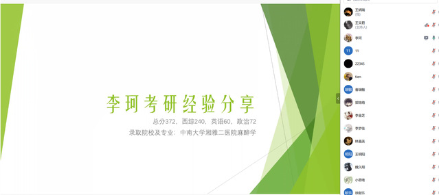 李珂中南大学湘雅二医院麻醉学专硕录取自己单词记忆、真题模拟、时间安排等英语复习技巧倾囊相授分享了相关学习资料及网课。王梓涵武汉大学第一临床学院麻醉学专硕录取)围绕初试准备、择校方向及备考心态等方面针对不同科目分享了自己个性化的初试备考方案结合自身条件介绍了如何选择合适院校作为考研目标提问环节同学们积极交流学习学姐们在备考心态调整、不同阶段备考侧重点、目标院校选择等方面提供了更具针对性建议