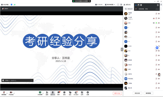 为强化学风建设,解答学生关切5月18日晚,2025年考研成绩优异的李珂、王梓涵同学线上分享学习方法及考研经验等,各年级同学学生家长踊跃参加。