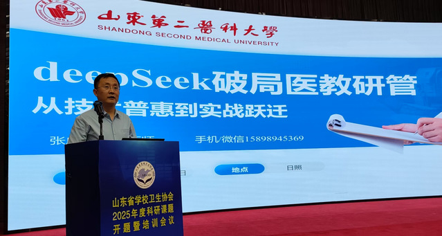 5月23日至25日,山东省学校卫生协会2025年度课题培训会议在日照举办,全省教育、医疗系统400余位专家学者参会。张成明副教授应邀出席会议,并作题为《DeepSeek赋能医教研管:从技术普惠到实践跃升》的学术报告。