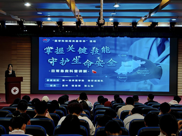 本次大赛分为初赛和决赛两个阶段。初赛采用闭卷考核形式,来自全校12个学院的近百支队伍踊跃参与、同台竞技,经严格选拔,10支优秀队伍脱颖而出,站上决赛舞台。决赛设置“演讲先锋”与“理论达人”两大核心环节。参赛队伍在“演讲先锋”环节,围绕海姆立克急救法、烫伤应急处理、高血压防治等日常急救热点,以规范的现场演示搭配通俗生动的语言,将专业医学知识转化为易懂实用的科普内容展示给观众。“理论达人”抢答环节中,10支队伍通过抽签分组面对面PK,大家争分夺秒,场上比分交替攀升,精彩对决赢得现场阵阵掌声。此外,题目紧扣生活实际,涵盖单选、多选及判断抢答等多种形式,不仅考验选手们的知识储备,更助力粉碎诸多生活中常见的健康谣言。比赛间隙,一段《无痛之约,向暖而行》的朗诵深情上演,生动诠释了镇痛医学的梦想与追求,为紧张的赛事增添了别样温情。经过激烈角逐,大赛最终评选出一等奖一组、二等奖二组、三等奖三组。
